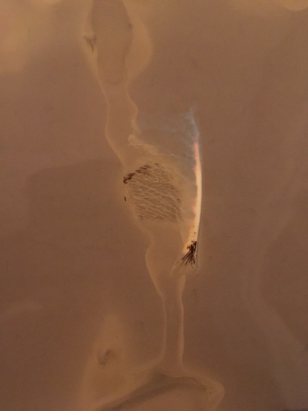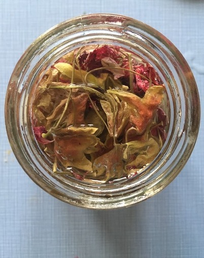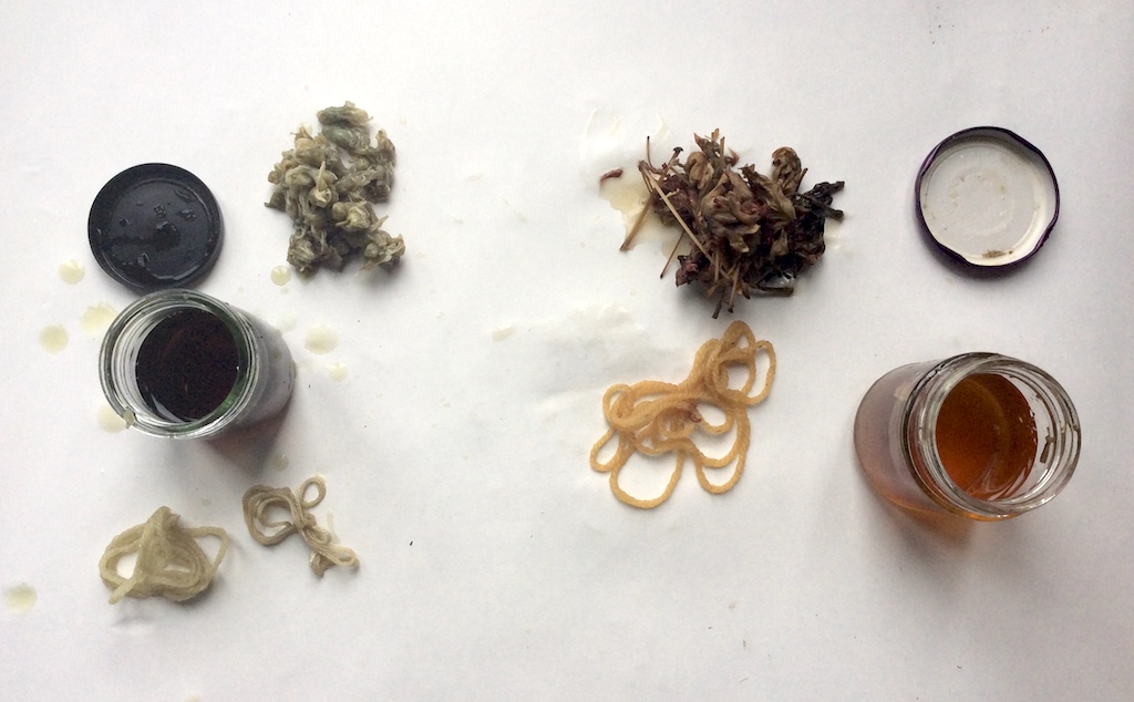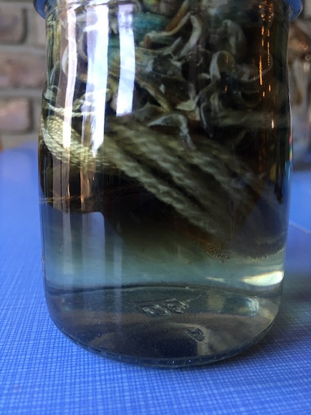 This is the first solar dye that I have created during the winter. I have always made solar dyes during the summer as the heat from the sun is needed to release the dye from the plants. This dye was made using dried flowers and leaves from one of the geranium plants in my kitchen and left to develop outside from December – February.